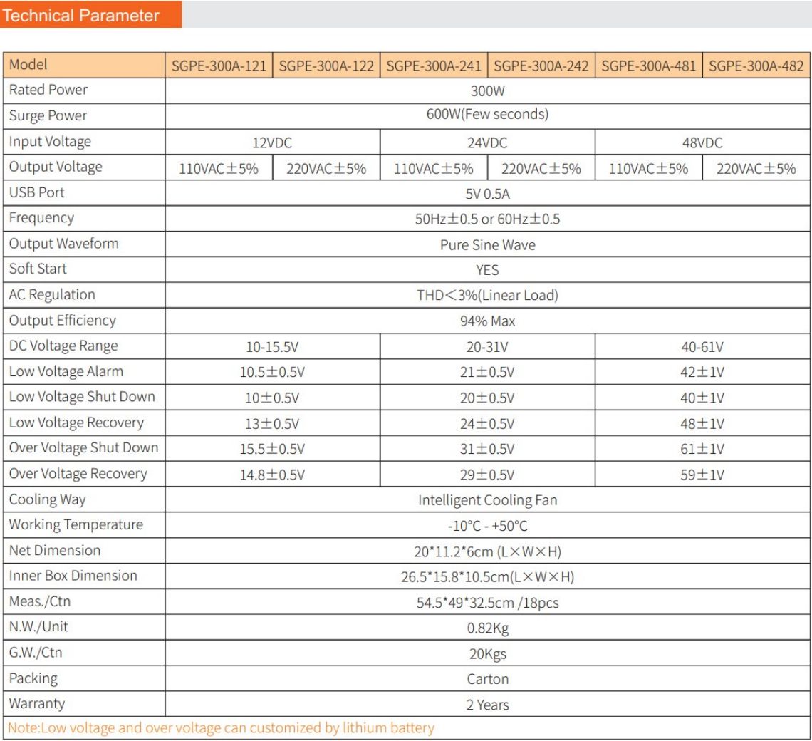 Big factory SGPE-300W 12-48VDC 110/220VAC DC to AC Power Inverter 300W Off Grid High Frequency 24v pure sine wave inverter