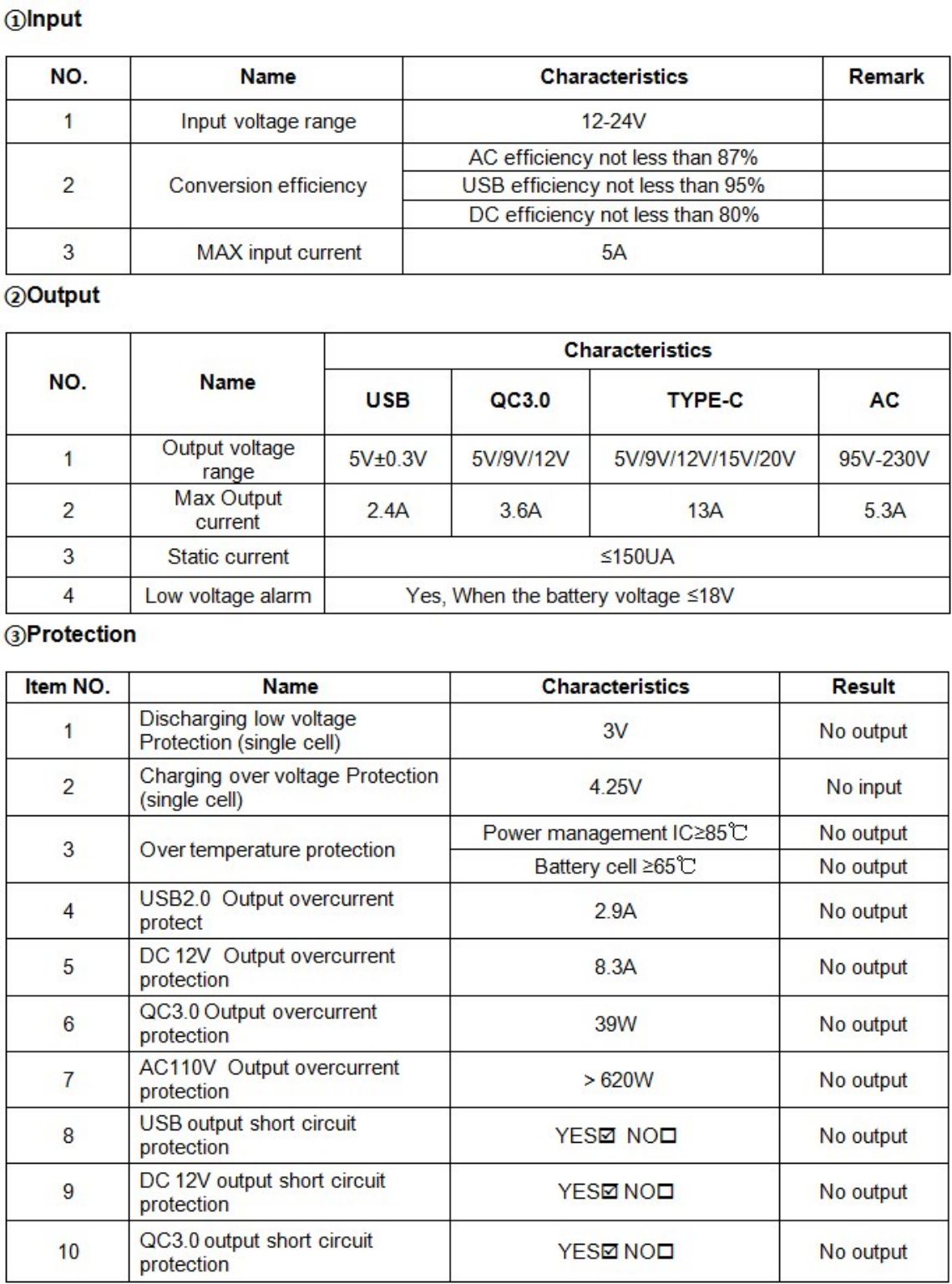 1.Please pay attention to the input and output voltage range when using this product. Make sure the input voltage and the power should be within the range of the energy storage power supply. The life span will be prolonged if you use it properly.