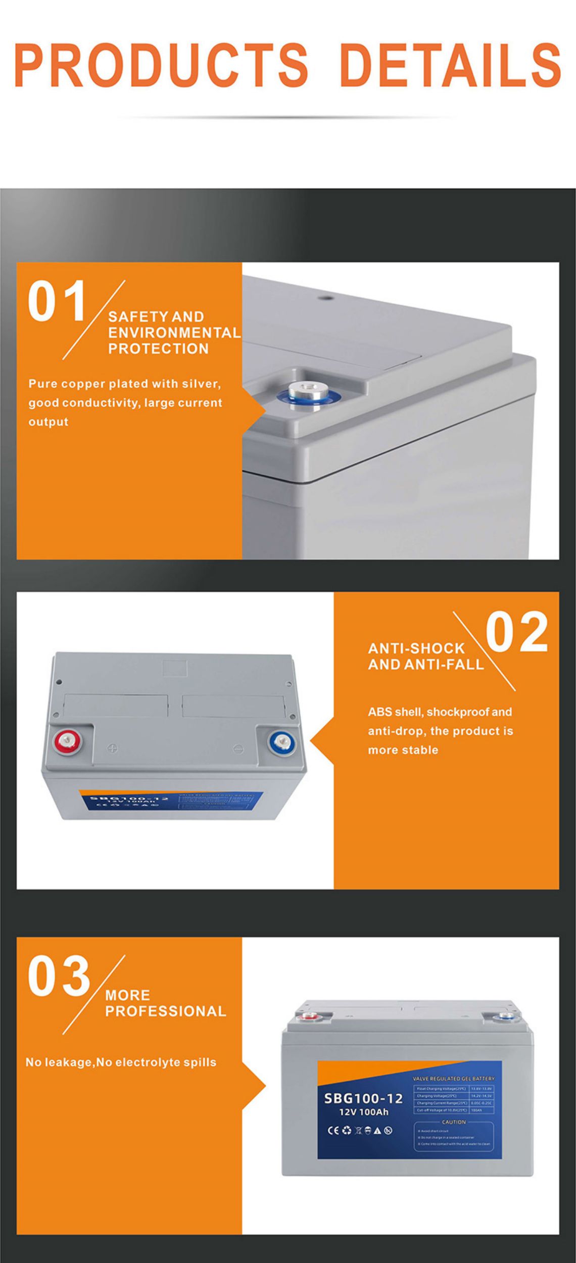 A special suction partition keeps the acid inside, and there is no free acid inside the battery, so the battery can be placed in any position.