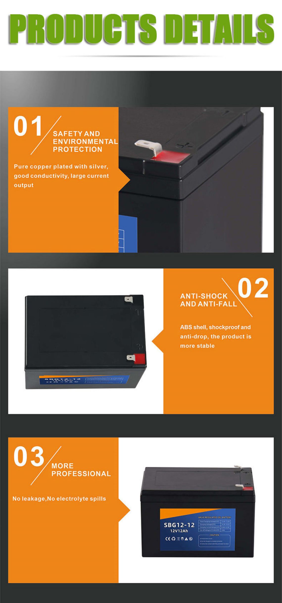 A special suction partition keeps the acid inside, and there is no free acid inside the battery, so the battery can be placed in any position.