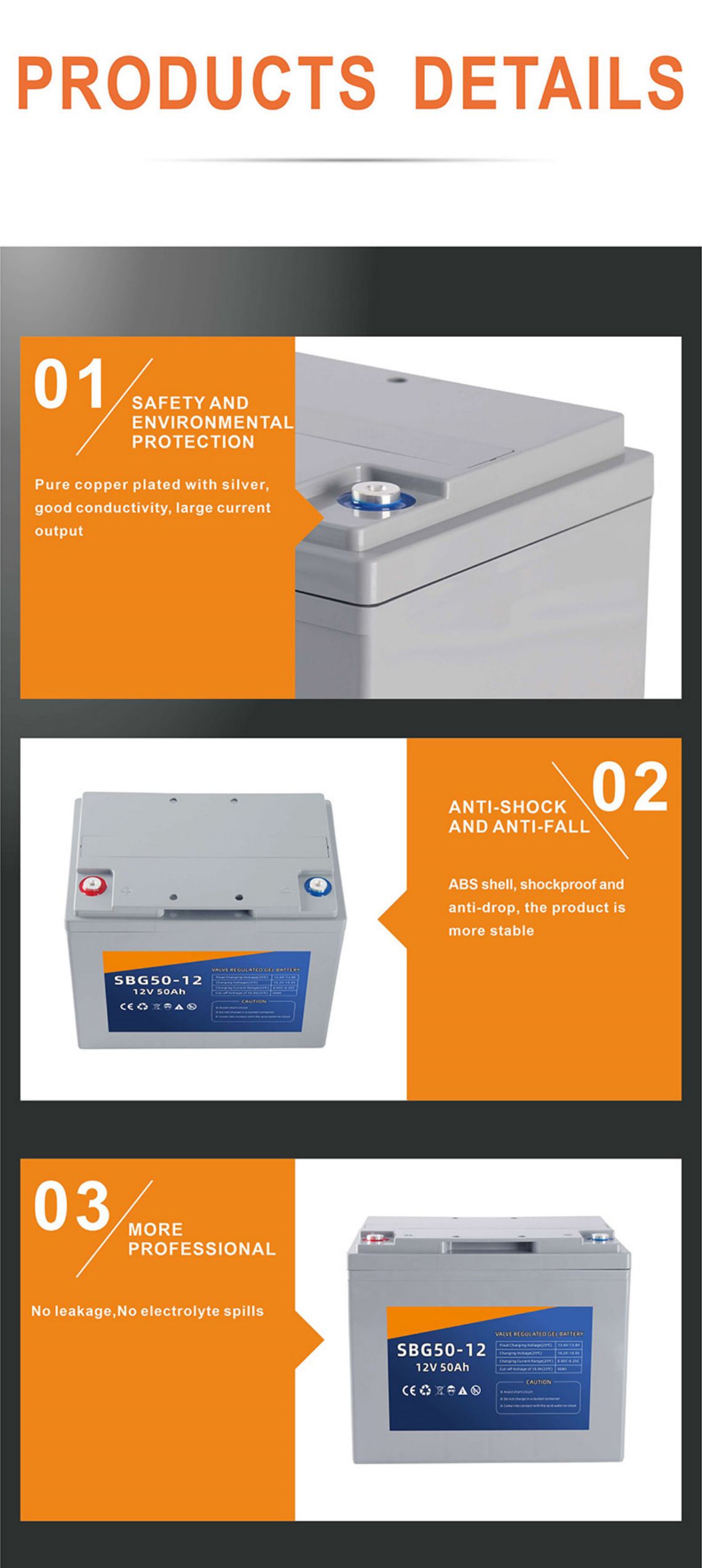 A special suction partition keeps the acid inside, and there is no free acid inside the battery, so the battery can be placed in any position.